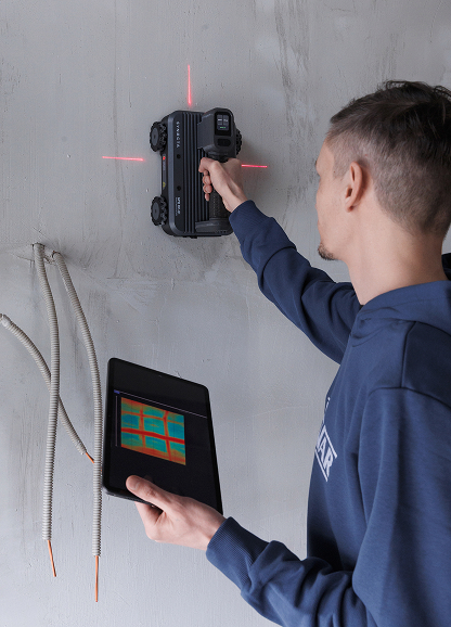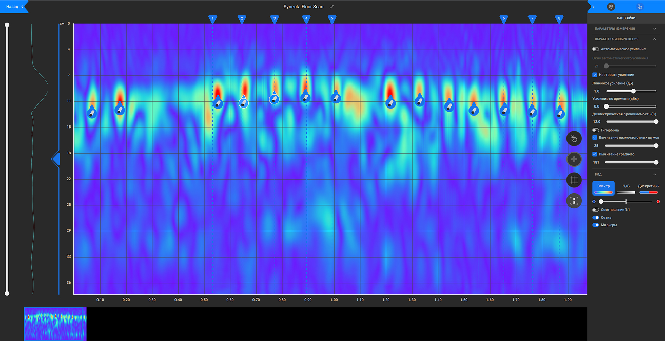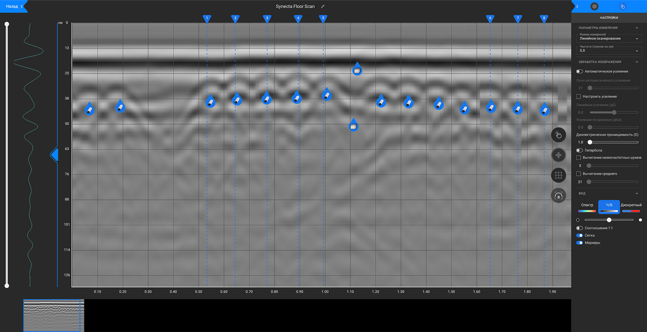 Для обработки и визуализации результатов исследования Георадар имеет быстрое беспроводное подключение по Wi-Fi, управление процессом сканирования осуществляется с устройства, сменные литий-ионные аккумуляторы удобны для непрерывной работы
