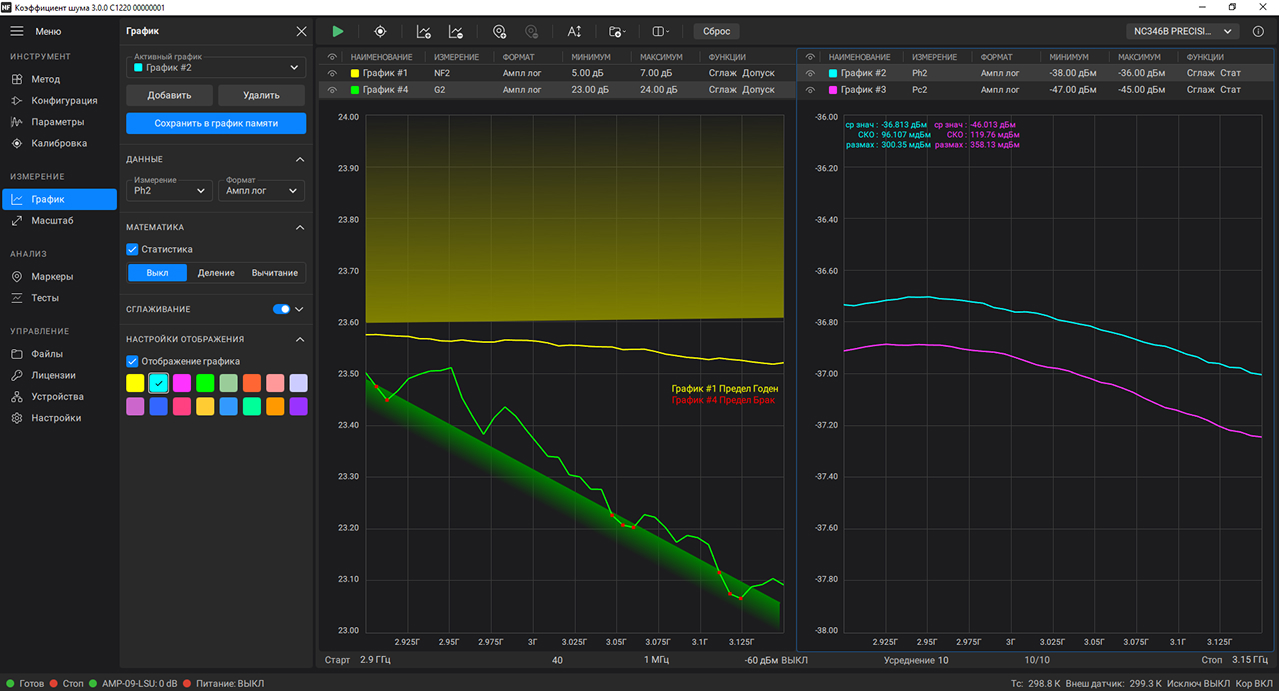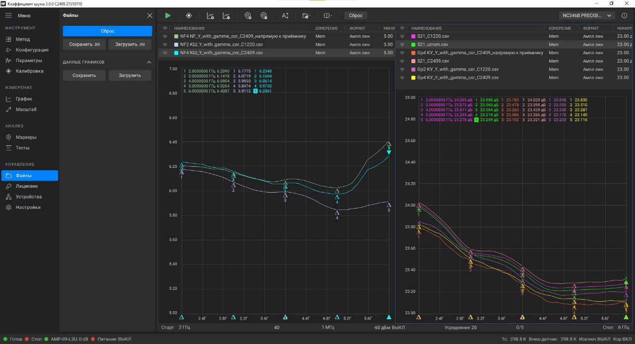 Программа автоматически подключается к малошумящему усилителю (МШУ) и сохраняет параметры генератора шума в библиотеке. Результаты отображаются в виде масштабируемых графиков с маркерами для анализа, а все данные можно сохранить в файл.